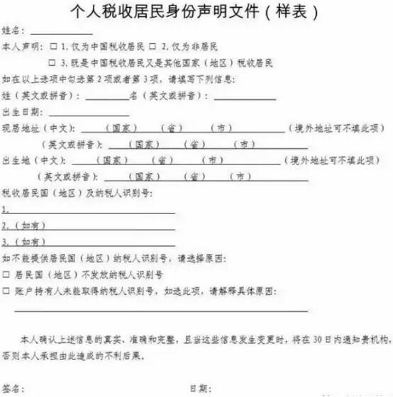 根據(jù)調(diào)查辦法的規(guī)定,從今年7月1日起,個(gè)人在金融機(jī)構(gòu)開立新賬戶時(shí),應(yīng)提供稅收居民身份聲明文件。具體解釋就是用來作為識別賬戶持有人是否為非居民個(gè)人。